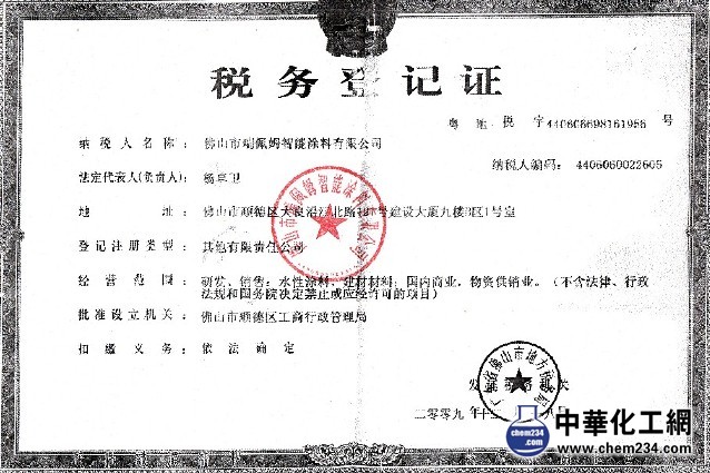 佛山市瑞佩姆智能涂料有限公司税务登记证