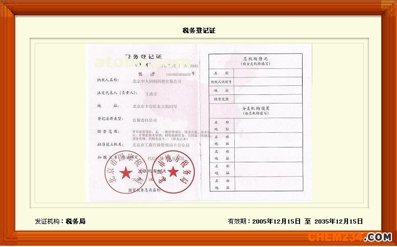 | 发证机构 | 税务局 | 发证时间 | 2004-12-15 |