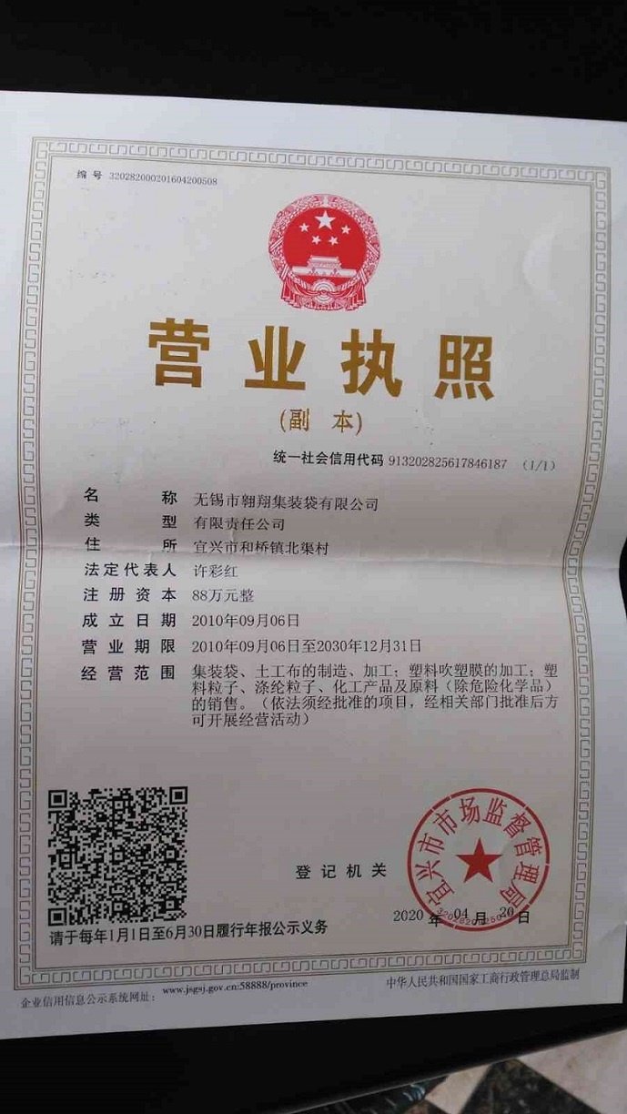 证书介绍 无锡市翱翔集装袋公司始创于1982年,是集装袋、吨袋等塑料包装袋制品的生产企业。主营生产:集装袋、吨袋、防水集装袋、导电集装袋、防静电集装袋、吨包袋、污泥集装袋、纸浆吨包、炭黑包装袋、软托盘袋、太空袋、洁净集装袋、土工布、FIBC等塑料包装袋类制品。联电:0510-85874165,QQ:123130154,123130154@qq.*;***.fibcton.*。