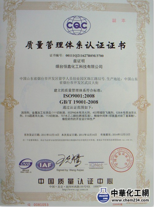 证书介绍 我公司通过认证范围:消泡剂、金属加工化学品(111切削剂、501聚乙烯醇水性淬火液、502PAG水性淬火剂、PAG水性蘸火液、402焊接防飞溅剂、511快速光亮淬火油、528水性类油淬火剂、516超速淬火油、113切削油、707水乙二醇抗燃液压液)、精细中间体(邻氨基对叔定基苯酚)、橡胶促进剂808、含氯橡胶用的噻二唑硫化交联剂ECHO.A的开发设计和生产 证书图片 |