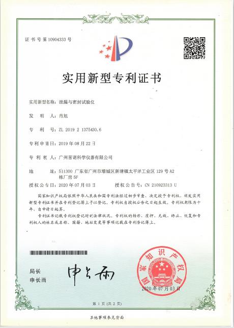 密封试验仪专利证书