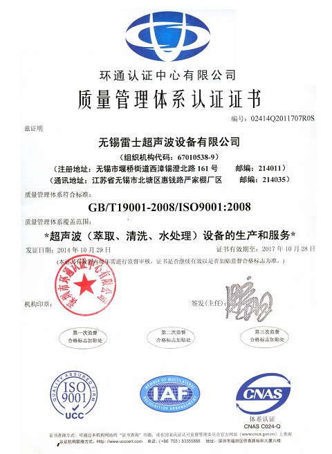 热烈祝贺无锡雷士超声波设备有限公司,获得ISO9001质量管理体系认证,综合各方面的考核,对产品的生产检验,原材料的各种检测,以及设备生产流程的监控,我公司在领导的带领下,通过了第一阶段和第二阶段的严格审核,在超声波清洗机的生产能力和设备管理中通过验收,对生产的关键过程和能力考评顺利通过验收,各项标准符合GB/T19001-2008/ISO9001:2008标准,我公司产品体系覆盖超声波清洗、超声波萃取、超声波水处理的生产和服务,今后我们将以此为契机,使超声波清洗机产品更上一层楼