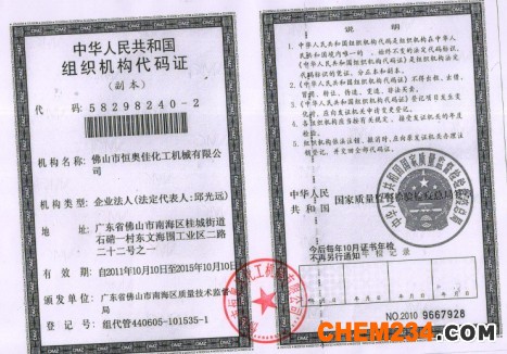 证书介绍 佛山市恒奥佳化工机械有限公司是一家专门从事精细化工、轻工、粘胶、塑胶、制药和干燥等生产设备及配套产品设计、制造、安装的专业性公司。公司经过多年的不断发展,现已拥有一批经验丰富的产品制造和技术开发人才。为公司生产高品质的产品和持续发展奠定了坚实的基础。公司不断吸收及引进国内外先进的技术,开发出多品种,高技术先进实用的化工生产设备,并能为用户提供整套先进的自动化生产线。