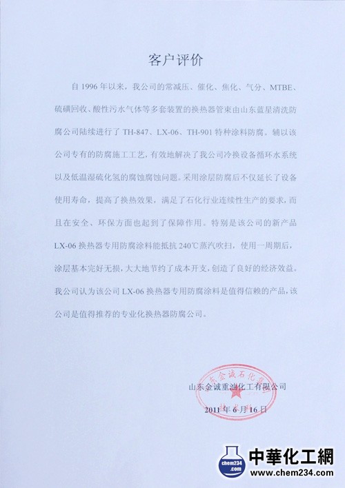 山东蓝星清洗防腐公司 经营范围: 1、清洗施工:对各行各业的锅炉、管线、热交换器、塔器、贮罐、中央空调进行化学清洗和预膜等。 2、涂层施工:对石油炼制、石油化工、化肥、制药、冶金、造纸、发电、印染、冷藏、运输、食品等行业换热设备的清洗和防腐等。其中包括:TH-847 TH-901 TH-99 LX-06 LX-07 3、镀层施工:对石油炼制、石油化工、化肥、制药、冶金、造纸、发电、印染、冷藏、运输、食品等行业换热设备的清洗和防腐等。其中包括:Ni-P Ni-Sn-P Ni-PTFE-P 电话:13854167280 传真:88991136 联系人:刘经理 公司网址:http://www.sdlanxing.com
