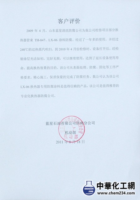 山东蓝星清洗防腐公司 经营范围: 1、清洗施工:对各行各业的锅炉、管线、热交换器、塔器、贮罐、中央空调进行化学清洗和预膜等。 2、涂层施工:对石油炼制、石油化工、化肥、制药、冶金、造纸、发电、印染、冷藏、运输、食品等行业换热设备的清洗和防腐等。其中包括:TH-847 TH-901 TH-99 LX-06 LX-07 3、镀层施工:对石油炼制、石油化工、化肥、制药、冶金、造纸、发电、印染、冷藏、运输、食品等行业换热设备的清洗和防腐等。其中包括:Ni-P Ni-Sn-P Ni-PTFE-P 电话:13854167280 传真:88991136 联系人:刘经理 公司网址:http://www.sdlanxing.com