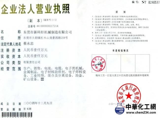 东莞市新科炬机械制造有限公司,企业法人营业执照。主营产品:超声波振动筛、长方形筛分机、圆形振动筛、白水过滤筛、平台筛分机、低矮筛、袋倾斜筛等