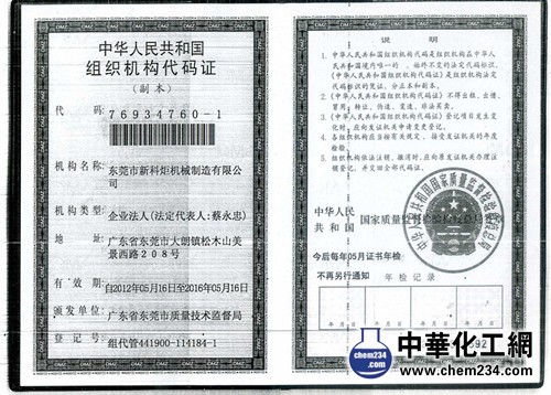 东莞市新科炬机械制造有限公司,组织机构代码证。主营产品:超声波振动筛、长方形筛分机、圆形振动筛、白水过滤筛、平台筛分机、低矮筛、袋倾斜筛等