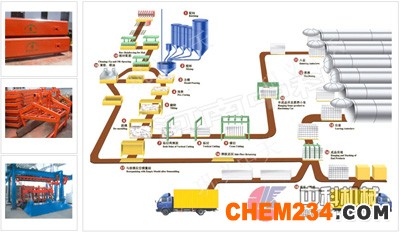 蒸压灰砂砖成套设备首先将贮存的原材料经计量配料(1)后进入浇注搅拌机内,经搅拌(2)均匀后浇注温度和时间的预养(4)坯体达到一定硬度后,由翻转吊具把模具和坯体吊至切割机上。翻转吊具完成下列功能:a把模具在空中作90度翻转(5)(模具的一侧板成为支承坯体的底板直至蒸养出成品),b吊运载小车或切割支撑架上完成开模、脱模(6),c脱下的模框和返回的蒸养侧板(16)再重新组合成模具(17)等待清理后喷油(18)重新浇注。坯体在切割机上分步作六面切割;a首先进行坯体两侧面垂直切割(7),b然后进行纵向水平式切割(8);c最后进行横向水平式切割(9)。切割好的坯体由半成品吊具连同底板吊至蒸养小车(10),然后编入蒸压釜(11)进行高温蒸养(12),蒸养好后出釜(13),由成品吊具将成品堆垛(14)或装车、打包(15),蒸养侧板则返回(16)。