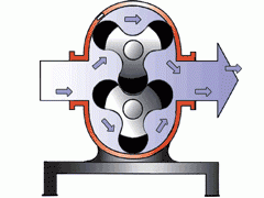•旋转凸轮泵的传动和传送是分离的,传动腔内有一对同步齿轮,它们在高效润滑液中,工作条件良好。两根轴通过这对齿轮同时驱动。因此,传送腔内的转子仅将传送物排走,故效率很高。通过实践证明,所消耗功率仅相当于一般泵的55%-75%。