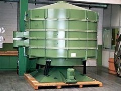 按积木式结构原理设计开发,由一刚性曲柄轴驱动,并进行了动态平衡。在可调整倾角的刚性曲柄轴的驱动下,圆形的筛机体可实现三维空间运动,即在水平的圆周运动上叠加一个垂直方向的上下运动。振动的参数随旋转速度、曲柄偏心度、径向倾角和切向倾角的大小而变化。这种设计构造,使得其工作参数的组合可以无穷的多,从而使得被筛分的物料可以以所期望的速度在筛网层上运动,或者在期望的时间内滞留在筛网层上。筛机振幅及物料的加速度随曲柄偏心度的大小而变化,曲柄轴的切向倾角的大小决定着物料在筛网上作圆周运动的速度;曲柄轴的径向倾角决定着物料从筛网中央向边缘运动的速度;切向和径向倾角的相互作用导致被筛分的物料在筛网上作一种螺旋渐开线运动,物料在筛网上停留的时间,即筛分的精度和度量是由切向和径向倾角大小的组合比例来决定的。