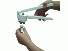 1、按上易拉盖或铝盖后,放进轧头内,上下轻轻按手柄,压到轧头收紧为止,(不必过分用力)放松手柄