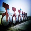 2.蒸压釜门为活动快开门结构,靠手摇减速机进行启闭,也可根据用户要求采用电动、气动、液动启闭。配备有完善的安全联锁保护装置,最大限度地避免了误操作隐患,确保了蒸压釜的安全运行和操作人员的安全生产。釜门开启型式有侧开和上开两种型式供用户选择。侧开式采用旋转臂式开门机构,转动灵活,低位操作,开启简单方便;上开式采用杠杆式开门机构,杠杆下端与釜门连接,上端装有配重装置,该型式开启轻便,釜侧占用空间小。