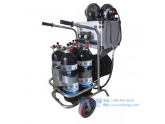 车载式移动供气源由4个或2个碳纤维气瓶(可选6.8升、9升气瓶配置)、不锈钢小推车、供气管、减压器、供气阀和全面罩等部件