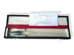 甲种土壤比重计是利用土壤不同颗粒的悬浮特性测量土壤密度的一种测量工具。 是做土工试验必不可少的试验仪器。密度计每台都有检测证书 .所配数据每台不同示例如下:浮泡体积(Vb):62.37立方厘米;浮泡中心至最低刻度的距离(Lo);9.10厘米;标尺总长:13.50厘米;配专用量筒的沉降距离校正式:L=a-bR;a=21.50;b=0.273;L(沉降距离校正值):厘米R:密度计读数;
