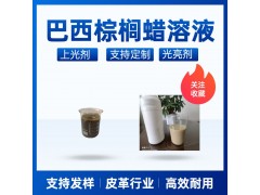 抛光型配方添加剂。具有优异的油感。经典、稳定、配伍性好的巴西棕榈蜡乳液,可以替代进口同类产品。在皮化、鞋化上具有上光、擦焦、变色、油感、蜡感等功能。在皮革等表面具有越抛越亮的特性,并提供饱满的蜡感和油感。其流平性和润饰性也是很明显的,尤其适用于棕色、黑色真皮。
