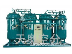 天奥系列制氮机是根据变压吸附原理,采用高品质的碳分子筛作为吸附剂,在一定的力学效应,氧在碳分子筛微孔中扩散速率远大于氮,在吸附未达到平衡时,氮在气相中被富集起来,形成成品氮气。然后减压至常压,吸附剂脱附所吸附的氧气等其它杂质,实现再生。一般在系统中设置两个吸附塔,一塔吸附产氮,另一塔脱附再生,通过PLC程序自动控制,使两塔交替循环工作,以实现连续生产高品质氮气之目的。压力下,经过净化干燥的压缩空气,在吸附器中进行加压吸附、减压脱附,得到高品质氮气。
