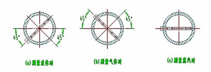 3、对于垂直管道,检测杆可安装在管道水平面沿管道圆周360°的任何位置上,高低压引压管接头应处于同一水平面上。对于水平管道,在测量液体时检测杆插入位置应位于管道横截面水平面中心线45°以下的范围内;测量气体时检测杆插入位置应位于管道横截面水平面中心线45°以上的范围内;测量蒸汽时检测杆应水平插入,见图:
