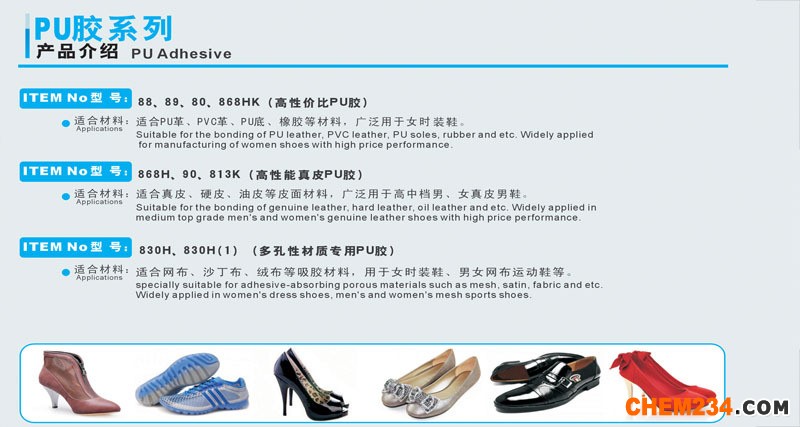二、PU胶”系列产品应用材料:可用于橡胶、PU、PVC、尼龙、EVA、TPR、TPU、真皮等材料的粘合。
