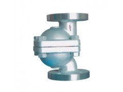 立式自由浮球式蒸汽疏水阀的结构简单,内部只有一个精细研磨的不锈钢空心浮球,既是浮子又是启闭件,无易损零件,使用寿命很长。装置刚起动时,管道内出现空气和低温冷凝水,双金属自动排空气元件把浮球推离阀座,阀门打开,排除不凝结气体,低温冷凝水流进疏水阀,浮球上升,凝结水迅速排放。装置很快提升温度,管道内温度上升到饱和温度之前,双金属自动排空气元件感温变型伸直;蒸汽疏水阀进入正常运行状况,浮球随液位升降调节阀孔流量;当凝结水停止进入时,浮球随介质流向逼近阀座,关闭阀门。立式自由浮球式蒸汽疏水阀的阀座总处于液位以下,形成水封,无蒸汽泄漏。