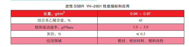 巴陵石化改性 SSBR 产品是溶液聚合法合成的苯乙烯 - 丁二烯共聚物,广泛应用于塑料改性、沥青改性、粘合剂、制鞋等应用领域。