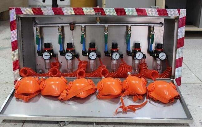 AYH-1A压风自救器一般形成系统后使用,即由若干组压风自救装置安装在同一个地点形成压风自救站,每组一般由3~5个头组成,每个地点装多少个头,应视该工作场所的工作人数而定,其安装头数应大于在该场所工作的人数。该装置系统结构简单,价格便宜,是一种经济型性自救装置系统。 作原理:装置由管道、开闭阀、连接管、减压组及防护套等5部分组成。当煤矿井下发生瓦斯浓度超标或超标征兆时,扳动开闭阀体的手把气路通畅,功能装置迅速完成泄水、过滤、减压和消音等动作后,此时防护套内充满新鲜空气供避灾人员救生呼吸。防护套内的空气压力为(0.05~0.1)Mpa,防护套外有毒气体的压力低于套内压力,因此外部有害气体不会进入防护套内对避灾人员造成危害。