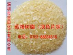 萜烯树脂系天然松节油加工而成的环保型树脂。具有透明、无毒、中性、电绝缘性、疏水、不结晶、耐稀酸稀碱、耐热、耐光、抗老化和粘接力强等良好性能。并对各种合成物质有良好的相溶性。易溶于芳香烃及植物油。
