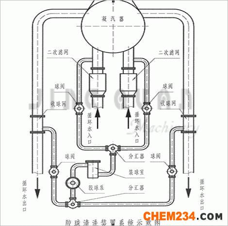 凝汽器胶球清洗装置由收球网,胶球输送泵,装球室,控制器,胶球及阀门管路等部件组成。它借助水流的作用将大于凝汽器冷却管内径的清洁胶球挤过冷却管,对冷却管进行反复擦洗。该装置可在机组不用停机、不减负荷的条件下,胶球在线清洗凝汽器冷却管内污垢及带出杂质,提高凝汽器内冷却管清洁度,提升凝汽器真空度和汽轮机热效率。