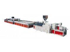 机组结构紧凑,性能优越。螺杆、螺筒经优化设计,并采用高性能合金钢专业加工,使整机具有塑化均匀,挤出量稳定,产量高,寿命长等优点。主机螺筒采用铸铝加热器加温,风冷却,精密电控仪表控制温度。精密的定型压光装置,通过其良好的调整功能使板材定型优良。切割部分采用定长切割装置,保证板材长度精确。板材挤出设备有异向平行双螺杆挤出机,板材模具,真空定型和八轮牵引等辅机部分组成,应用前景十分广阔,