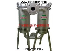 由二个圆柱体组成,内、外表面抛光,顶部装有压力表、排气阀,管道接头采用胀合连接,经1.0MPa 水压试验,三通外螺纹旋塞启闭灵活,该设备结构紧凑,操作方便,维修简单。适用于除去鲜奶、糖液、饮料、口服液等液体中各种肉眼看不见的固体杂质的净化。两只过滤器交替使用,可在不停机的情况下更换过滤袋,适于长期连续生产.