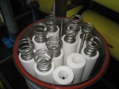 侧入底出方式滤芯过滤器,5芯,滤芯长40寸,最高工作压力0.6Mpa,进出口径为2” 国标法兰, SUS304材质,螺栓式锁紧装置.
