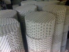 瓷规整填料是一种新型规整填料,它是由许多具有相同几何形状的填料单元体组成。由于陶瓷独特的结构,具有良好的亲水性能,其表面可形成极薄的液膜的湍动及气流的倾斜曲折通道能促进气流但又不阻挡气流使陶瓷填料能与金属填料相匹敌,而其耐腐蚀、耐高温性能金属填料却无法相比。表面结构有良好的湿润性能,能使液体加快流动、使填料滞液量降至最低。从而降低了过热、聚合和结焦的机会。 这种产品是由高品质的化工瓷土原料加工而成,可耐高温高压,化学稳定性好而且强度较高,是支撑各种类型的催化剂的理想载体