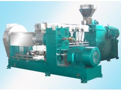 化学交联造粒机组第一阶为KS型高速同向双螺杆挤出机,第二阶为KSD系列单螺杆挤出机,构成双阶式复合机组。化学交联电缆料偏心水雾造粒机基本结构形式:1.PE原料仓 2.抗氧剂料仓 3.DCP贮罐 4.失重电子秤 5.失重式计量泵 6.双螺杆主机 7.单螺杆主机 8.偏心水雾切粒机 9.离心脱水机 10.沸腾床 11.成品料仓 12.自动包装机 双阶式机组的另一应用范例,与低压短流道机头,偏心水雾热切技术相结合,使PE树脂,抗氧剂等实现高效低温混合混炼,避免预交联。