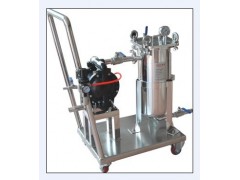 LT移动式带泵过滤机包括一台不锈钢袋式过滤器和一台气动双室隔膜泵,一台手推车,隔膜泵进料口可用软管连接,把需要过滤的液体物质抽进泵后经过袋式过滤器,利用泵的输送压力过滤出来。过滤器和隔膜泵都装置在手推车的安装平台,可随意移动到任何工作生产线上一步到位固定安装进行过滤。是粘稠性较高的物质过滤最佳选择。本厂可以根据客户需要上门设计工程方案。