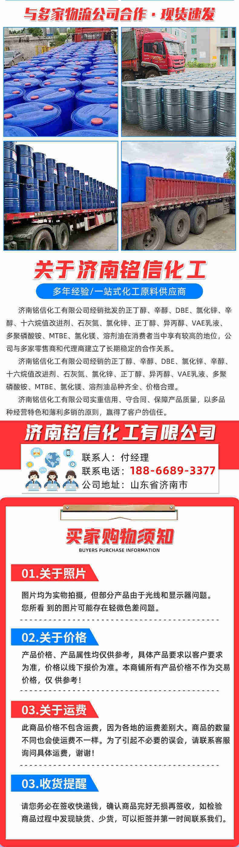 正丁醇、辛醇、DBE、氯化锌、辛醇、十六烷值改进剂、石灰氮、氯化锌、正丁醇、异丙醇、VAe乳液、多聚磷酸铵、MTBE、氯化镁、溶剂油