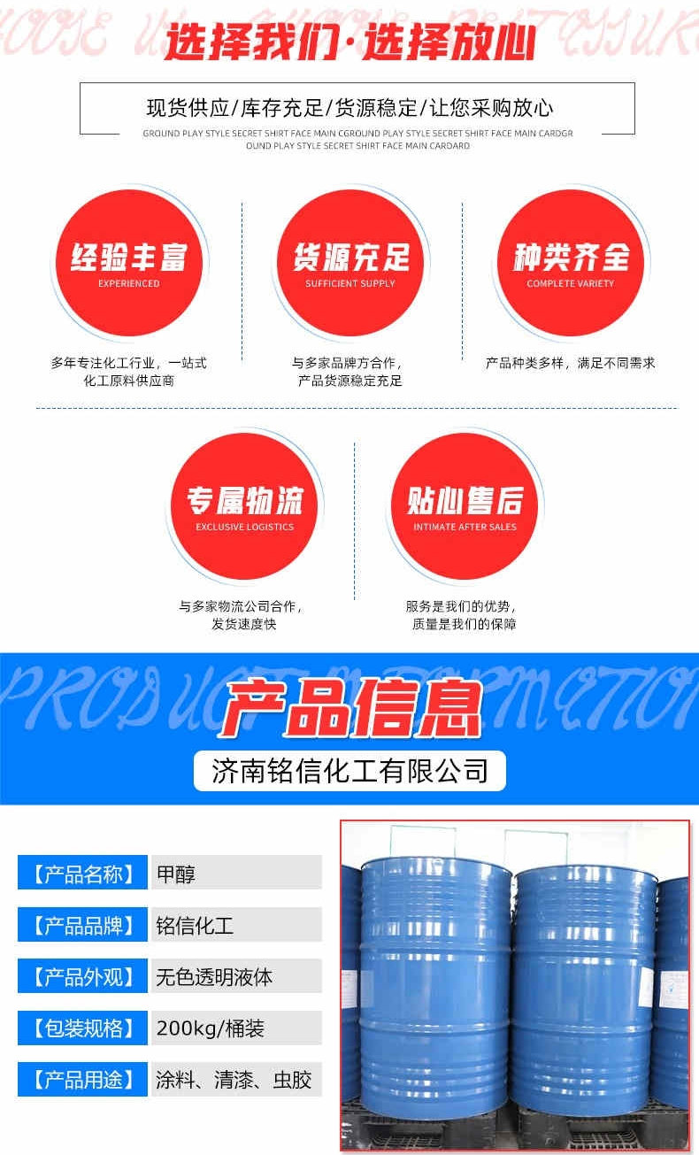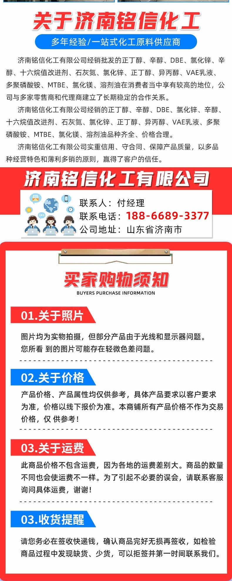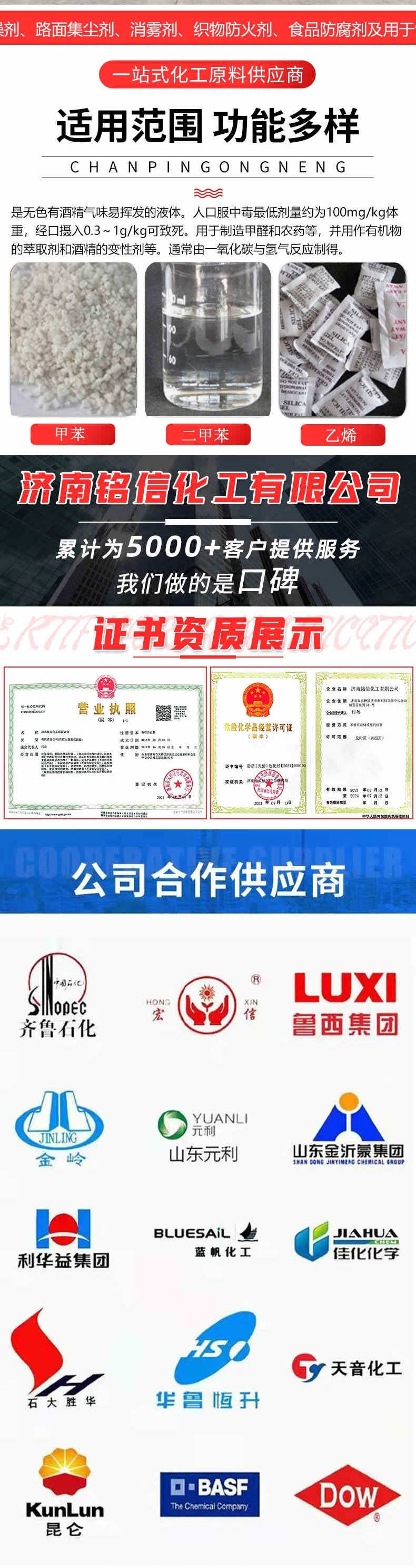 正丁醇、辛醇、DBE、氯化锌、辛醇、十六烷值改进剂、石灰氮、氯化锌、正丁醇、异丙醇、VAe乳液、多聚磷酸铵、MTBE、氯化镁、溶剂油