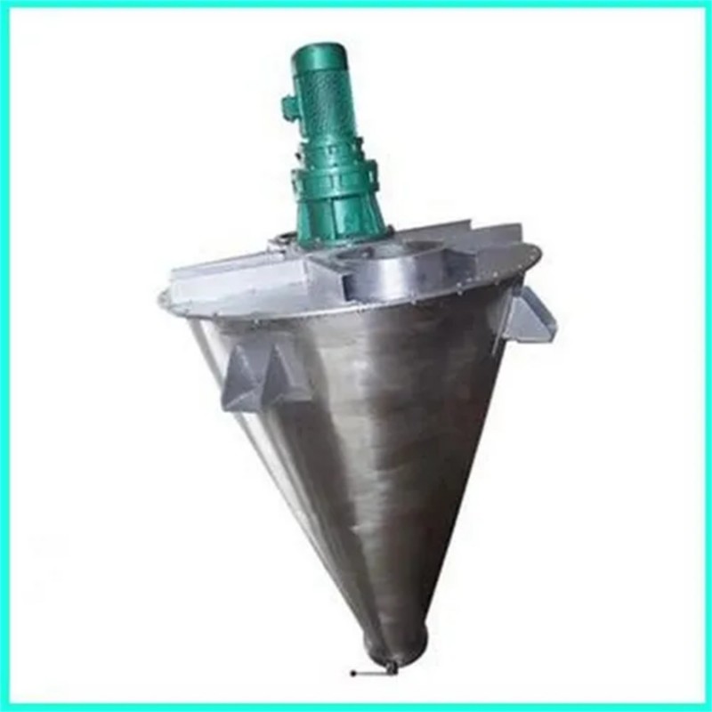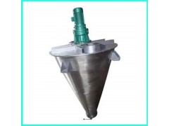 双螺旋锥形混合机,它由喷液装置、传动部分、筒盖、螺旋、筒体、出料阀箱等组成。喷液装置由旋转接头和喷液部件组成,喷液部件用法兰固定分配箱下端盖上,由公转带动一起运转,旋转接头和喷液部件为活动连接,以便旋转接头固定在管道上。由自转电机和公转电机的运动,通过蜗轮蜗杆、齿轮调整到合理的速度,然后传递给螺旋实现自、公转两种运动。筒盖支撑着整个传动部分,传动部分用螺旋固定筒盖上,筒盖上设有若干也供料、观察、清洗、维修用。筒体内两只非对称排列的螺旋作自、公转行星运动时,在较大范围翻动物料,使物料快速达到均匀混合。筒体为锥形结构,作乘物料用,使出料迅速、干净、无积料,无出料死角。