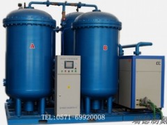 经过净化干燥的压缩空气,在吸附器中进行加压吸附、减压脱附。由于动力学效应,氧在碳分子筛微孔中扩散速率远大于氮,在吸附未达到平衡时,氮在气相中被富集起来,形成成品氮气。然后减压至常压,吸附剂脱附所吸附的氧气等其它杂质,实现再生。一般在系统中设置两个吸附塔,一塔吸附产氮,另一塔脱附再生,通过PLC程序自动控制,使两塔交替循环工作,以实现连续生产高品质氮气之目的。