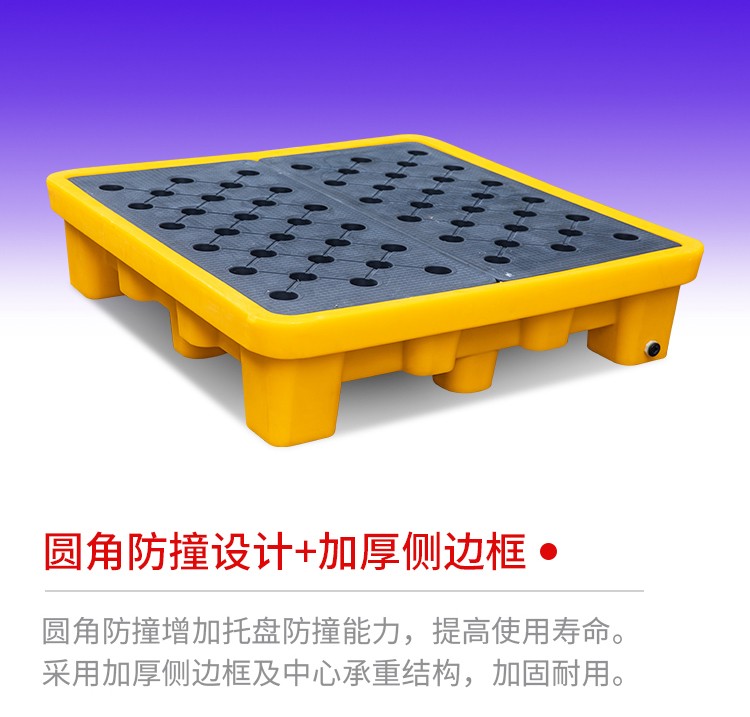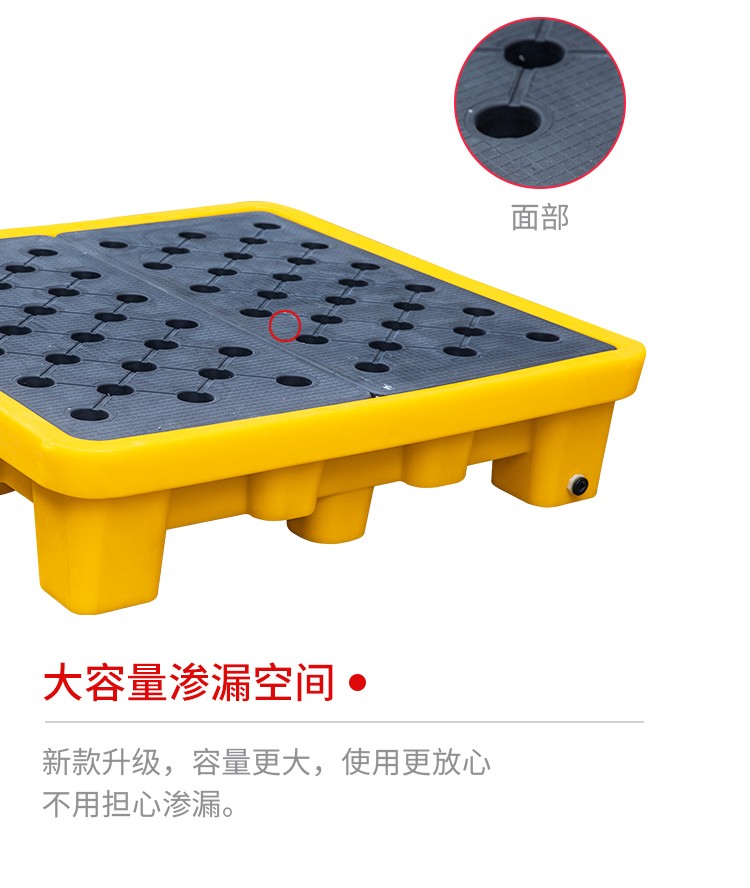 赛普塑业生产的6767双桶防渗漏平台,采用新款加厚隔板,产品耐酸碱耐腐蚀,载重量大,采用滚塑技术生产,表面光滑无毛刺,内部120升大储漏空间,当发生泄漏时,泄露液体都会沿隔板注入托盘内部,不污染环境。
