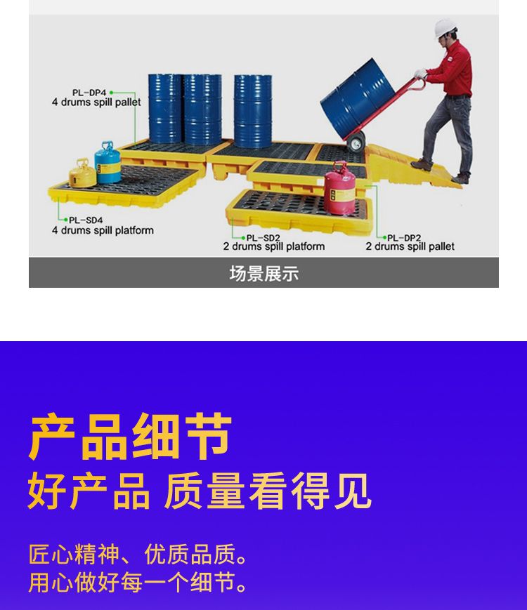 目前很多化工厂、废物处理厂,实验室都存放有油桶、化学品桶或一些化学品容器,这些东西,都可能因储存、使用、运输过程中出现泄漏、飞溅等情况。出现这种情况首先会污染工作环境,影响清洁生产;还有可能引发摔跤跌倒等安全事故;泄漏物还有可能流入下水道或雨水口,污染水体和土壤,对环境造成恶劣影响,严重的危险化学品泄漏甚至会危及到人们的生命健康。这些安全隐患,都应该引起我们的足够重视。为了避免发生以上情况,或在发生后及时处理,降低风险,就要用到防渗漏托盘了。