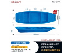 塑料船舶轻便防水3.2米平头渔船划水观光工具厂家出售 规格:长320cm 宽115cm 高35cm 配件:船桨、马达 重量:60kg 适用行业:水产养殖、捕鱼、钓鱼、打捞、水上娱乐等行业 本款渔船可装配电动马达、配套船桨,购买整套更划算,规格齐全,等您下单