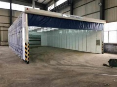 喷漆房后部采用防火岩棉夹芯板(可更换为镀锌板制作)作为底板,并合理设置多个吸风口,喷漆房内漆雾能有效进入后道废气处理装置。伸缩式喷漆房采用活动式框架结构,内衬玻璃纤维防火篷布,通过进出口门头处的驱动电机,通过轨道带动整体结构进行伸缩运动;非工作时间可将喷漆房整体折叠,节省了车间场地,作业时根据实际情况调节入口处卷帘,控制补风,从而提高作业时产生漆雾的回收效果。