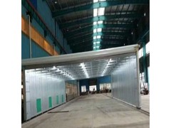 整体移动式喷漆间的设计目的,是为了满足较大型工件 打磨或喷漆的需要。一般情况下每套房体对应2~3个排风净化工位,哪个工位上的工件需要喷漆时,房体则行走移动到那个工位,其他工位可以继续打磨工作,待 房体内的工件喷漆完毕后,再控制移动房体行走到打磨完毕后的工件工位,如此设计可以实现大型工件的不间断连续喷漆工作。房体为钢结构构造,房体立柱下面设置有两台电动驱动行走机构,行走机构沿地面轨道行走。移动房体两端设置有电动卷帘大门,房体行走时,大门升起,待到达位置时,大门降落关闭。大门与行走机构由电气控制部分连锁控制,大门完全升起后,房体才可移动行走。