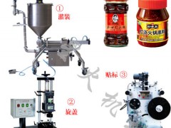 ③ 火锅底料旋盖机 用于火锅底料、汤料等产品灌装后的旋盖设备,该旋盖机锁盖范围宽,可旋各种形状规格的瓶盖,旋盖速度快,旋盖牢,同时也可根据需要调节松紧度,操作方便。