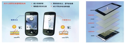 光学透明胶粘剂可用作透明光学材料的粘接,如ITO膜、PMMA、PC、PET、玻璃、电子纸、投影屏组装、显示器组装、镜头组装、电阻式触摸屏G+F+F、F+F、电容式触摸屏、面板、ICON及其他相关电子光学材料的粘接。这些透明的无基材的各向同性胶粘剂可确保精确的色彩和充分的显示亮度,并提供耐久、高强度的粘接效果。