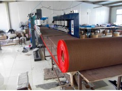 采用先进的进口织机,采用优质的高强度进口玻璃纤维或凯夫拉为基材编织成高强度的耐高温漆布,再涂覆优良特性的特(铁)氟龙树脂 制成特(铁)氟龙输送带的基布,再经过特有生产工艺而制成各种规格的烘干输送带。