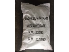 物化性质:六水硝酸镁为无色结晶,属单斜晶系,是常温下最为稳定的硝酸镁水合物,相对密度1.461,熔点95°C(分解),至400°C以上时,完全转化为MgO。易溶于水,可溶于甲醇及乙醇。与有机物混合后会发生自燃。
