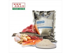 动物蛋白水解酶是本公司新开发的一种针对动物蛋白水解的专用复合酶制剂,其主要由蛋白内切酶、外切酶和风味酶等组成,通过内切酶从中间切断蛋白质内部的肽链和外切酶从多肽链的未端切断释放出氨基酸,而风味酶对水解的苦味与风味起着优化作用,可广泛应用于动物蛋白如鸡猪牛等家禽肉类、骨类肉副产品、鱼虾蚌类等水海产品的蛋白水解,生产各种肉类香精、骨汤料、肉类及海产品的抽提物。