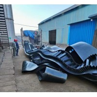 定做大倾角输送机皮带是由基带、挡边、横隔板3部分组成的。挡边主要起防止物料侧滑撒落的作用。同时为了便于绕过滚筒,设计者特意将档边设计成波纹状。横隔板的作用是承托物料,考虑到大倾角输送的功能,设计者还特意采用T型TC型的横隔板。而且档边和横隔板是用二次硫化的方法与基带连接的,因此具有很高的连接强度。