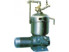 结构及原理 电机通过摩擦离合器螺旋齿轮副驱动转鼓绕主轴线做高速回转。料液由上部中心进料管流至转鼓底部,经碟片座下面的分流孔的趋向转鼓壁。在离心力场作用下,壁液体重的固相物沉向转鼓内壁形成沉渣,待停机后人工卸除。轻液沿锥形片外(上)锥面向轴心流动至上部轻轻液向心泵,由轻液出口排出。重液沿碟片内(下)锥面趋向鼓壁,然后向上流经重液向心泵由重液出口排出。从而完成重液 与轻液的分离。 主要特点: 分离能力强,分离因数在5000-9500之间;生产能力大,最高达10米3/小时;结构简单,操作维修方便,价格便宜。 主要用途: 用于乳浊液及固形物含量为1-5%的悬浮液的分离,例如,燃料油润油的再生,胶乳分离,硝化甘油,苯酸(胺制造中),树胶,萃取四环素、青霉素、细菌、生物碱、乳品的分离等,植物油精制。