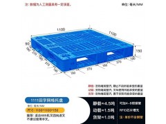 1111网格田字托盘是1.1米*1.1米的塑料托盘,高0.15米,田字托盘底部六根主梁交叉,呈“田”字型故而得名,面板为网格,是一种标准的方形塑料托盘。可四向进叉,但是由于进叉口原因,仅适用于机械叉车及液压叉车作业,不适用于手动叉车,因手动叉车不方便进入田字托盘的叉孔。可内置8根钢管,用于增加动载及作用于货架使用。